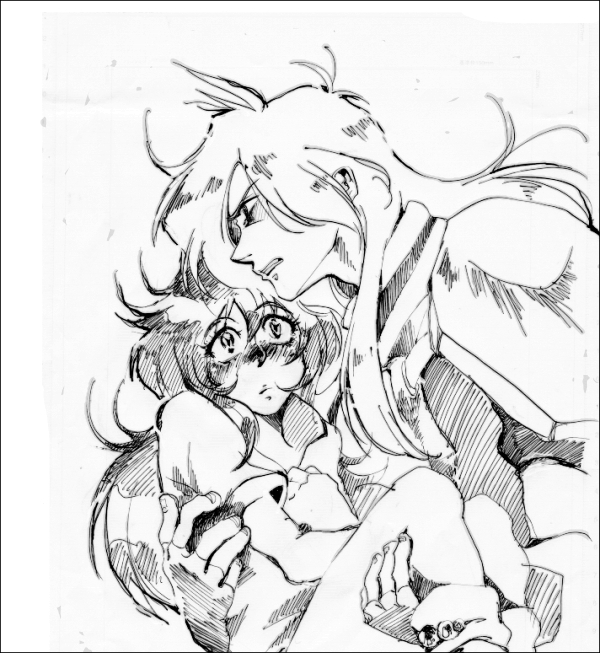 路地裏の階段とかに座って、ひっついてヒソヒソ話しをしているような所を描きたかったんですが、装備があるとひっつきにくかったので外しました。